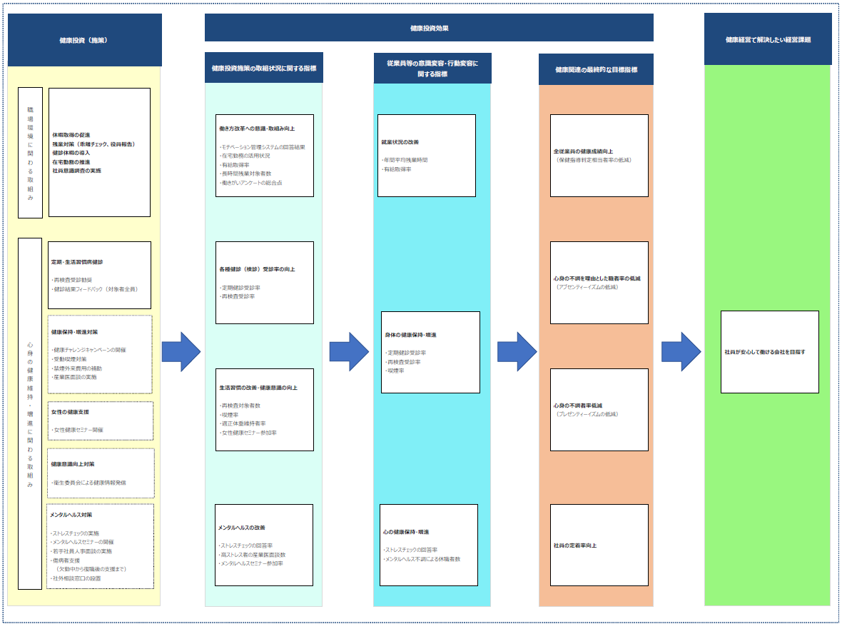 健康経営 健康経営でめざす姿と健康関連施策とのつながり 健康経営でめざす姿と健康関連施策とのつながり インフォテック・サービス 健康経営でめざす姿と健康関連施策とのつながりの紹介です。 健康経営でめざす姿と健康関連施策とのつながり インフォテック・サービスは、健康経営でめざす姿と健康関連施策とのつながりを図にすることで、解決したい経営課題を意識しながら各施策に取り組んでいます。また各施策による効果を数値データにより判定しています。