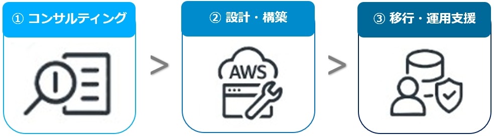 - 既存システムからのデータ移行をはじめ、AWS環境へのスムーズな切り替えを支援します。